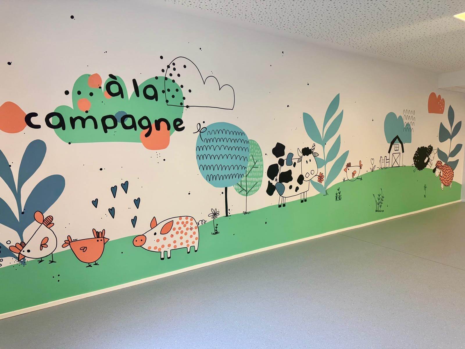 La couleur blanche est prédominante dans le projet, représentant la pureté de l’enfance. Les touches de couleur sont apportées ponctuellement par des fresques uniques réalisées par une artiste locale.
