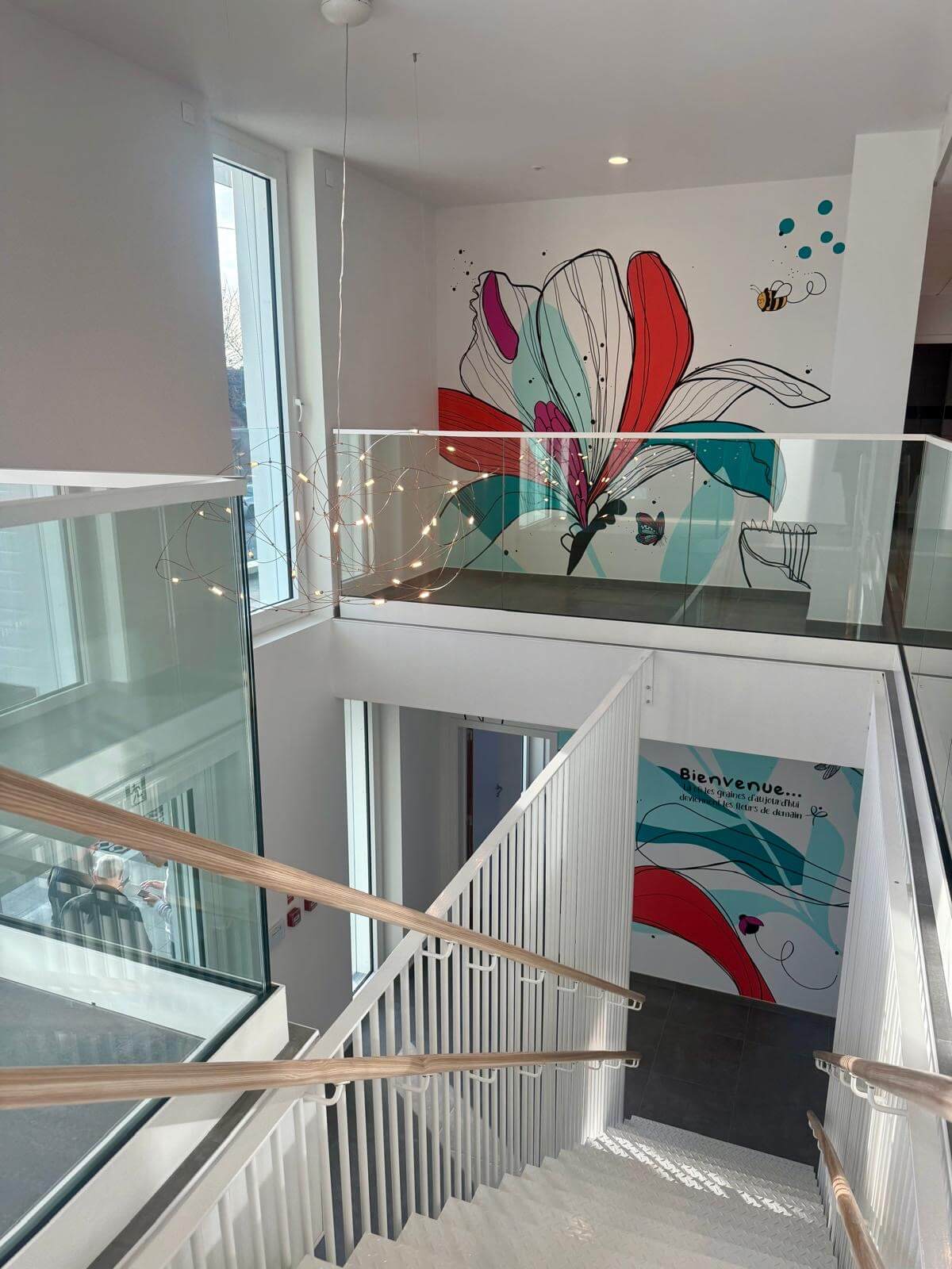 Le bâtiment accueille quatre sections réparties sur deux niveaux et baignés de lumière naturelle, permettant un encadrement optimal des enfants. Chaque section bénéficie d’un accès direct à un espace extérieur sécurisé.